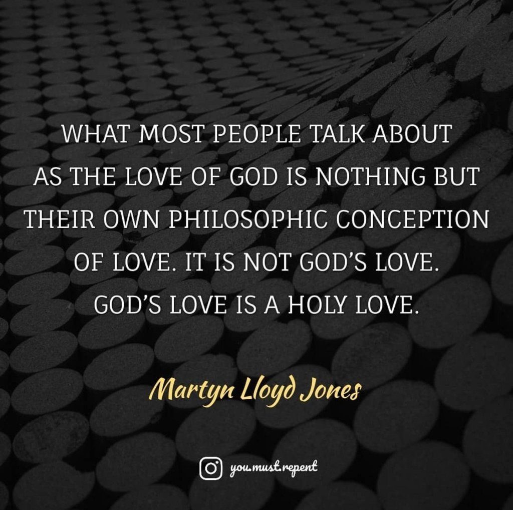 We have forgotten somehow that before and above all things God is Holy. Therefore His love comes WITH holy standards. It is a love which demands morality and a foundation of truth from which to be built on. There is no Godly love apart from Godly truth. Therefore God’s love has standards and requires obedience. It’s a “just and righteous” love. It demands repentance and submission. For apart from repentance there is no heaven, only Hell. You cannot have God’s love without God’s just wrath. If “God IS love” His love requires it.