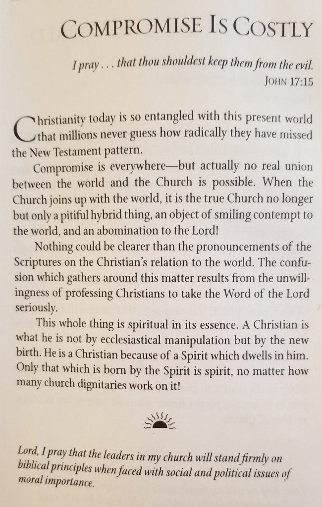 I want to share this devotion below from A. W. Tozer. I think it fits here because though it may not be as blatant and obvious, because many believers are standing for it in the Church, that to be focused on and fighting for a politically conservative agenda because of your desire to maintain a certain lifestyle and to hold onto your wealth and to protect and prolong your security here is just as worldly as those on the left. You see, Marxism and socialism are not bad ideas. Hear me out here. The problem is that man apart from God is trying to create this idea. It is a God idea. But it can never work outside of Christ. One great picture of Christian socialism is found in the book of Acts. Because when the Body-of-Christ acts like the Body-of-Christ we all will love and give and share when there is a need between brothers and sisters in the Church. We do not treat the world this way, it is only for the “Church”. Because when Christ is Lord of your wealth you freely give to His children in need. Hear me loud and clear. THIS IS ONLY DOABLE IN THE BODY-OF-CHRIST. Therefore, Marxism and socialism will never work in the “world”. Finally, read this devotional below because whether we are conservative or liberal Christians, if we are not standing on Christ alone and fighting for the Kingdom to come, the eternal imperishable one, instead of the one presently here which will perish and fade away, then we’re not walking in the light, and we will not discern what is good and right according to our Lord, and we will not be going in the same direction as Him. Lastly, our Lord says, “I will be their God, and they shall be my people. Therefore go out from their midst, and be separate from them, says the Lord,…” (2 Cor. 6:16b-17a)